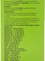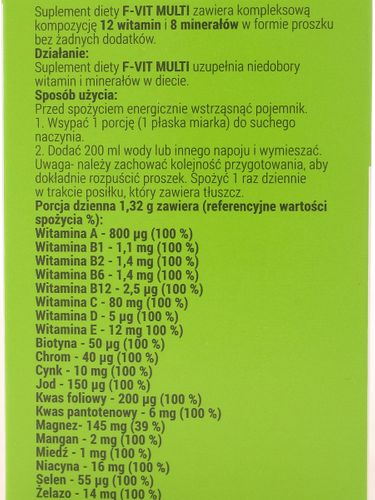 | | Opis produktu: | | |  | | | Pełny opis produktu - kliknij tutaj | | | | | | Składniki: | |  | | Porcja dzienna 1,32 g zawiera (referencyjna wartość spożycia %): Witamina A- 800 µg (100 %), Witamina B1- 1,1 mg (100 %), Witamina B2- 1,4 mg (100 %), Witamina B3 (niacyna)- 16 mg (100 %), Witamina B5 (kwas pantotenowy)- 6 mg (100 %), Witamina B6- 1,4 mg (100 %), Witamina B7- (biotyna)- 50 µg (100 %), Witamina B9- (kwas foliowy)- 200 µg (100 %), Witamina B12- 2,5 µg (100 %), Witamina C- 80 mg (100 %), Witamina D- 5 µg (100 %), Witamina E- 12 mg (100 %), Chrom- 40 µg (100 %), Cynk- 10 mg (100 %), Jod- 150 µg (100 %), Magnez- 150 mg (40 %), Mangan- 2 mg (100 %), Miedź- 1 mg (100 %), Selen- 55 µg (100 %), Żelazo- 14 mg (100 %). | | | | | | Stosowanie: | |  | | Należy wsypać 1 porcję (2 miarki) do naczynia a następnie dodać 200 ml wody lub innego napoju i wymieszać. Spożyć 1 raz dziennie w trakcie posiłku | | | | | | Opakowanie: | |  | | | 39,5g 30 porcji | | | | | |  | | | | | |  | |