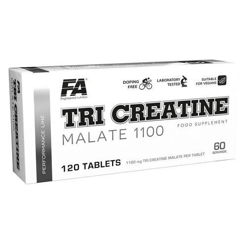 FA Performance Tri Creatine 1100 to suplement diety stanowiący źródło wysokiej jakości kreatyny w formie jabłczanu. Produkt ma formę tabletek z których każda zawiera 1100mg jabłczanu kreatyny. FA Performance Tri Creatine 1100 zwiększa syntezę protein powodując szybszą rozbudowę masy mięśniowej. Pozwala także zwiększyć rezultaty siłowe oraz wytrzymałościowe. Jabłczan kreatyny jest formą nie powodującą retencji wody do mięśni, dlatego idealnie sprawdza się w okresie odchudzanie lub budowania suchej masy mięśniowej.