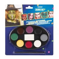 Zestaw składa się 8 kolorów farbek (biały, czerwony, żółty, zielony, brązowy, fioletowy, czarny, szary), gąbeczki do rozcierania oraz pędzelka do precyzyjnego nakładania farbek na twarz. Dzięki takiemu zestawowi można stworzyć unikalne stylizacje pasujące do strojów karnawałowych oraz malowania na urodzinach, imprezach okolicznościowych, Halloween, itp.