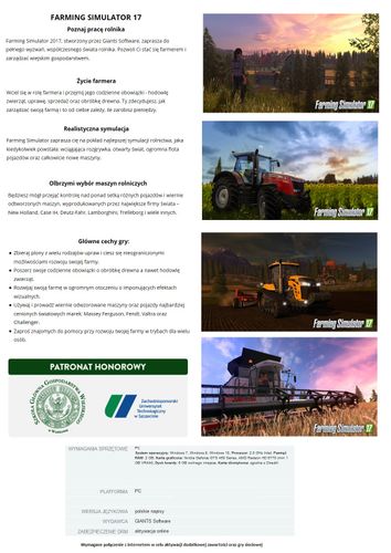 Farming Simulator 17 na PC Windows to kolejna odsłona serii Farming Simulator. Produkcja ponownie pozwala wcielić się w rolnika, który musi zarządzać swoim gospodarstwem. By tego dokonać, należy przede wszystkim zaopatrzyć się w odpowiednie narzędzia i maszyny, które wykorzystujemy do sadzenia, siania, zbierania plonów oraz przewożenia towarów. W odróżnieniu od poprzednich odsłon cyklu, produkcja zadebiutowała jednocześnie na konsolach i komputerach osobistych.