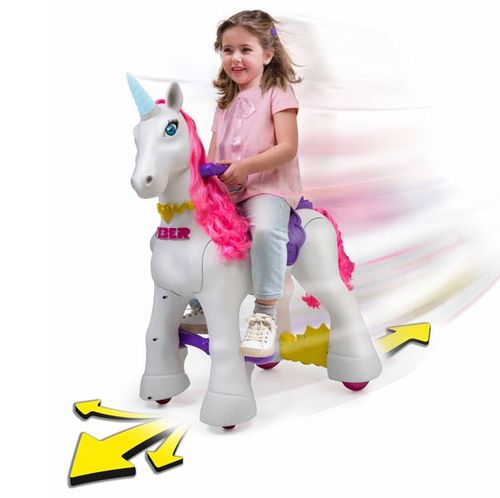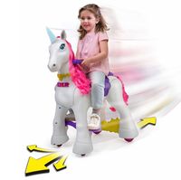 Usiądź na elektrycznego jednorożca i poruszaj się na nim, dzięki lejcom można sterować do przodu i do tyłu oraz skręcać w lewo i w prawo. Jednorożec został wyposażony w uchwyt, za pomocą którego można go przemieszczać. Róg posiada wbudowany moduł świetlno dźwiękowy. W zestawie znajduje się szczotka i akcesoria do czesania grzywy.