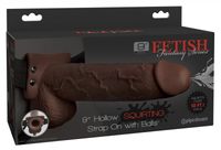 Realistic, hollow strap-on dildo with balls and stretchy straps. The bulging guy stands out with its realistic details and because it's completely life-like. Furthermore, the additional squirting function provides their user with a breathtaking sperm feeling. It can be worn by men and women.