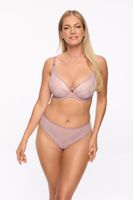 Figi 1291B Liwia w kroju brazilian to elegancki i zmysłowy model w odcieniu wrzosu. Przód wykonano z lekkiego, elastycznego tiulu, a tył oraz nogawki zdobi miękka koronka, która subtelnie podkreśla sylwetkę. Całość uzupełnia delikatna tasiemka w kolorze wrzosowym oraz bawełniany klin zapewniający komfort noszenia.