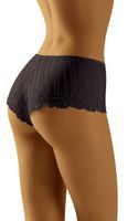 Śliczne szorty wykonane z tkaniny w ażurowe paseczki. Brzegi subtelnie zdobione, podkreślają linię pośladków. Skład: 83% poliamid, 17% elastan.