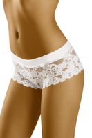 Śliczne, koronkowe figi, które nieco przypominają shorty. Kwieciste, delikatne i bardzo eleganckie. Wokół bioder gładki pasek tkaniny. Skład: 83% poliamid, 17% elastan.