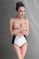 Damskie figi z wyższym stanem w kolorze czarnym. Optycznie modelują brzuch i biodra. Przód bielizny wykonany z satynowej wkładki w kolorze beżowym. Tył i boki to przeźroczysta siateczka, spod której delikatnie przebija ciało. Figi z cienką gumką i uroczą kokardką. W dolnej części bawełniana wkładka. Marszczenie na pośladkach optycznie je zaokrągli i podniesie. Skład: 76% poliamid, 24% elastan.