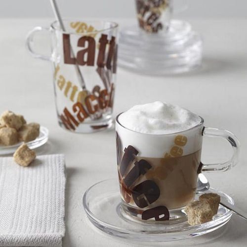 Szklany kubek Loop z uchwytem. Idealnie nadaje się na espresso. Przyciąga wzrok brązowo-beżowymi napisami. Charakterystyczny, pofalowany brzeg kubka i ergonomiczny uchwyt sprawiają, iż picie kawy staje się przyjemnością.