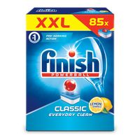 Klasyczne tabletki Finish działające w 2 obszarach, posiadają funkcję wstępnego namaczania. Dostępne w wersji regularnej i cytrynowej.