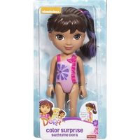 Ta piękna 20-centymetrowa lalka Dory ubrana jest w uroczy różówy strój kąpielowy i wprost nie może się doczekać kolejnej kąpieli! Jej włosy zebrane są w wysoki kucyk, a pasemko zmienia kolor pod wpływem ciepłej i zimnej wody – z różowego w fioletowy! Dziewczynki będą uwielbiały odgrywać kolejne przygody Dory podczas kąpieli oraz obserować magiczną zmianę koloru.