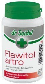 Flawitol Artro zapewnia psu odpowiednią dawkę substancji aktywnych działających ochronnie na stawy. Jego skład został przygotowany w oparciu o wyniki najnowszych badań dotyczących wpływu składników pokarmowych na przebieg choroby. Zawiera chondroitynę, glukozaminę oraz boswellię, dzięki czemu pobudza wytwarzanie kolagenu i innych składników chrząstek, hamuje aktywność enzymów rozkładających chrząstki stawowe, chroni przed pogłębianiem się objawów klinicznych zapalenia stawów. Regularne stosowanie preparatu : - Ogranicza objawy bólowe - Działa przeciwzapalnie - Pobudza wytwarzanie kolagenu i innych składników chrząstek - Hamuje aktywność enzymów rozkładających chrząstki stawowe - Chroni przed pogłębianiem się objawów klinicznych zapalenia stawów Flawitol Artro wspomaga zachowanie sprawności fizycznej u psów (szczególnie starszych). Ogranicza takie objawy osteoarthritis jak: niechęć do wychodzenia na zewnątrz, problemy z chodzeniem po schodach, kulawizny oraz ostre objawy bólowe. Dzięki zastosowaniu wyjątkowej kombinacji wielu składników aktywnych działanie preparatu jest nie tylko objawowe, ale także przyczynowe - poprzez zahamowanie procesu degradacji chrząstek stawowych i pobudzanie wytwarzania nowych. Dodatek flawonoidów w preparacie zwiększa odporność organizmu na wiele chorób (w tym nowotworowych) i opóźnia procesy starzenia.