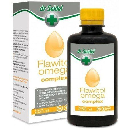 Zastosowanie Jest to w pełni naturalny preparat odżywczy bogaty w Niezbędne Nienasycone Kwasy Tłuszczowe (NNKT). Stanowi doskonałe źródło witamin A, D3 i E. Zwiększa odporność organizmu i zapobiega powstawaniu procesów zapalnych. Uwagi Chronić przed światłem. Po otwarciu przechowywać w chłodnym miejscu i zużyć w ciągu 3 miesięcy. Zalecenia - w okresie wymiany okrywy włosowej - w przypadku podrażnień skóry, łojotoku i łupieżu - w okresie ciąży i karmienia dla zapewnienia prawidłowego rozwoju i wzrostu - polecany dla psów i kotów w każdym wieku. Dawkowanie Stosować jako dodatek do karmy w dawce: 10ml/10kg masy ciała dziennie (1 łyżeczka do herbaty odpowiada 5 ml płynu). Dla uzyskania najlepszego efektu zaleca się regularne stosowanie przez min. 6-8 tygodni. Profilaktycznie może być podawany w sposób ciągły. Składniki aktywne Oleje rybie - z łososia i pstrąga, oleje roślinne (w tym olej lniany). Zawartość składników: - NNKT omega 3 - 19,1% - NNKT omega 6 - 30,7% W tym: - EPA - 17,8% - DHA - 14,6% Wartość energetyczna: 100 g preparatu: 3560 kJ/ 850 kcal. Skład Wartość energetyczna: 100 g preparatu: 3560 kJ/ 850 kcal. Opakowania 250 ml