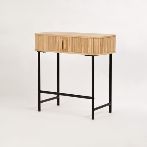 Oryginalna konsola w stylu retro z korpusem w kolorze naturalnego drewna i czarnymi, metalowymi nogami. Konsola charakteryzuje się przesuwnymi drzwiami z harmonijkowych listewek.