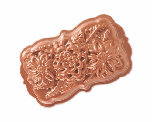 Forma została wykonana z kutego aluminium - wysokiej jakości materiał zapewnia, że nasze ciasto zawsze piecze się równomiernie. Wnętrze zostało pokryte nieprzywieralną powłoką. Gwarantuje to, że wypieki zawsze bezproblemowo wyjdą z formy, jak również łatwość czyszczenia. Ozdobiona motywem w kształcie liści paproci i kwiatów, w kolorze miedzi.