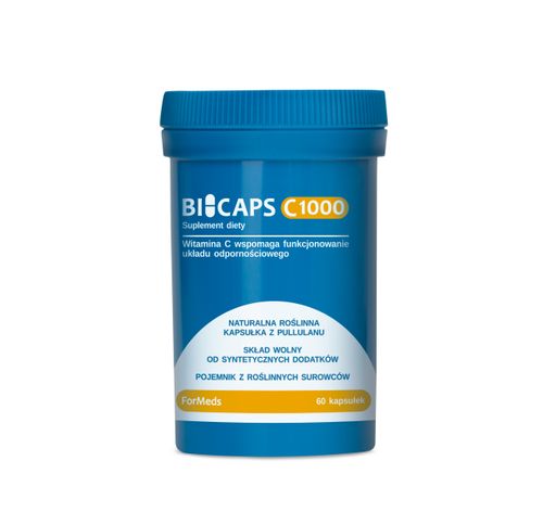 Suplement diety BICAPS C 1000 zawiera 1 000 mg witaminy C w 1 kapsułce bez żadnych dodatków. Witamina C posiada konfigurację L, została otrzymana w drodze fermentacji i nie jest produkowana z GMO. Produkt odpowiedni dla wegetarian i wegan. Naturalna kapsułka z pullulanu Pullulan jest otrzymywany w naturalnym procesie fermentacji. Podczas produkcji nie stosuje się surowców pochodzenia zwierzęcego, dlatego kapsułka jest odpowiednia dla wegetarian i wegan. Przejrzysty skład Produkty nie zawierają sztucznych wypełniaczy, przeciwzbrylaczy i barwników, takich jak: stearynian magnezu, dwutlenek krzemu, dwutlenek tytanu itp. Pojemnik z roślinnych surowców Pojemnik wykonany jest z roślinnych i odnawialnych surowców nie GMO. Etykieta jest w pełni biodegradowalna i nadaje się do kompostowania.