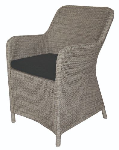 Fotel obiadowy Marina w beżowym kolorze pasuje do klasycznych oraz minimalistycznych ogrodów. Na jego nieskomplikowaną, geometryczną formę składają się lekkie oparcie i wąskie podłokietniki. Siedzisko zostało uszyte z wodoodpornego materiału, który jest bardzo łatwy w pielęgnacji. Wystarczy przetrzeć go ściereczką z mikrofibry. Do produkcji fotela ogrodowego Marina wykorzystano ekorattan – tworzywo odporne na zmienne warunki atmosferyczne, w tym deszcz i promieniowanie UV. Pasuje również na balkon oraz taras.