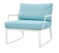 Błękitny fotel Tampa. Fotel ogrodowy o wymiarach 77x78x70 cm, został wykonany z białego aluminum, które charakteryzuje się dużą odpornością na panujące warunki atmosferyczne. Fotel Tampa posiada bardzo wygodną poduchę w błękitnym kolorze zarówno na siedzisku, jak i oparciu, dzięki czemu mamy zapewniony wysoki komfort odpoczynku. Zastosowanie tkaniny agora pokrytej akrylem w poduszkach sprawia, że jest odporna zarówno na promienie UV, jak i wodę. Fotel jest bardzo łatwy w czyszczeniu, zarówno ramę, jak i same poduszki należy przecierać delikatną ściereczką z mikrofibry nasączonej wodą z mydłem. Prosta, lekka forma sprawdzi się zarówno w nowoczesnym ogrodzie, jak i designerskim tarasie.