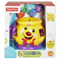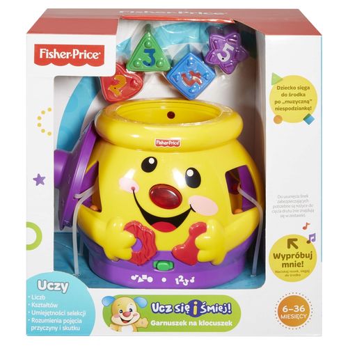 Interaktywna zabawka z serii laugh & learn™, której celem jest nauka poprzez zabawę. Potrafi zająć malucha na długo. ŁąCzy najlepsze cechy zabawek manualnych i rozwijających zdolność myślenia. Uczy liczb i rozpoznawania kształtów. Dziecko wkłada do odpowiednich otworów klocki, a garnuszek w nagrodę śmieje się i mówi, jaki mają kształt i jakie znajdują się na nich cyfry. Zabawka rozpoznaje moment, gdy dziecko wkłada do wnętrza rączkę lub klocki. Gra wesołe piosenki i może „porozumiewać się” z dzieckiem po polsku. W komplecie znajduje się uśmiechnięty magiczny garnuszek, pokrywka i 5 klocków w różnych kształtach. Zabawka ze specjalnymi nagraniami w języku polskim. Wymagane 3 baterie aa (znajdują się w zestawie).