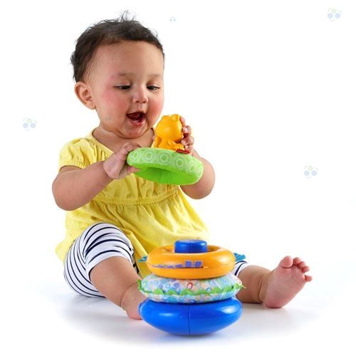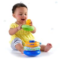 Układanie dzwoniącej, grzechoczącej i szeleszczącej obręczy na kołyszącej się podstawie sprzyja rozwojowi zręczności oraz koordynacji wzrokowo-manualnej oraz pomaga stymulować zmysły wzroku, słuchu i dotyku dziecka.