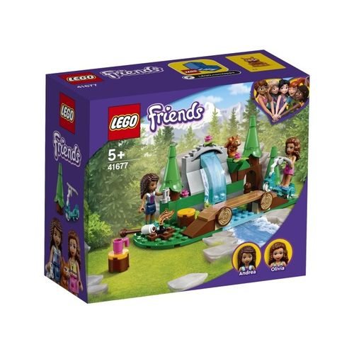 Model zawiera minilaleczki LEGO® Friends Andreę i Olivię, figurkę wiewiórki, skuter, ognisko, piankę na patyku, mostek przez rzekę oraz leśny wodospad.