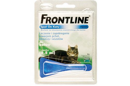 FRONTLINE® Spot-On zapewnia długotrwałe i skuteczne zabezpieczenie Twojego psa i kota przed inwazją pcheł, kleszczy i wszołów. Zabija 98-100% pcheł obecnych na zwierzęciu przed upływem 12 godzin * Zapewnia skuteczną ochronę przed inwazją pcheł u kotów do 5 tygodni Zabija wszystkie formy rozwojowe kleszczy pasożytujących na zwierzęciu przed upływem 48 godzin Zabija 100% wszołów obecnych na zwierzęciu Stosowanie kąpieli nie wpływa na skrócenie okresu skutecznego działania ** FRONTLINE® Spot-On zapewniając Twojemu zwierzęciu nieprzerwaną ochronę przed pchłami, kleszczami i wszołami. Działa tak delikatnie, że można go bezpiecznie stosować kociąt w wieku od 8 tygodnia życia, o wadze poniżej 1kgFRONTLINE® Spot-On ma postać płynu łatwego do podawania, gwarantującego Twojemu zwierzęciu ochronę przeciwko pchłom, kleszczom i wszołomFRONTLINE® Spot-On zalecany jest w następujących przypadkach: Właściciele kotów oczekują szybkiego i długotrwałego działania zapobiegawczego przeciw pchłom, kleszczom oraz wszołom Dla właścicieli kotów, którzy preferują "punktowe" podawanie preparatu (w jednym miejscu na skórze) Rutynowe zabiegi zapobiegawcze przeciw inwazji kleszczy, pcheł i wszołów oraz zapobiega i leczy alergiczne pchle zapalenie skóry (APZS)FRONTLINE® Spot-On jest produktem wygodnym w użyciu i odznaczającym się wysoką skutecznością. Wystarczy jeśli podasz go 1 raz na miesi��c aby zapewnić Twojemu zwierzęciu ochronę prze inwazją pcheł, kleszczy i wszołów.FRONTLINE® Spot-On ma postać płynu łatwego do podawania, gwarantującego Twojemu zwierzęciu ochronę przeciwko pchłom, kleszczom i wszołom i dostępny jest w pipetach których zawartość stanowi pojedynczą dawkę indywidualnąSkład:ipronil 10g/100ml, roztwór do nakrapiania. Przeciwskazania: Nie należy stosować preparatu u kociąt w wieku poniżej 8 tygodni i/lub o wadze poniżej 1 kg Nie stosować u kotów chorych (choroby układowe, stany gorączkowe) lub w okresie rekonwalescencji. Nie stosować u królików, u których preparat może wywoływać objawy niepożądane, a nawet prowadzić do śmierci.Dawkowanie:maksymalna zalecana dawka: 25 mg/kg mc. Podawać miejscowo na skórę.Sposób podawania Wyjmij pipetkę z opakowania. Podważ i usuń aluminiową osłonkę chroniącą pipetkę. Otwórz pipetkę. Trzymając ją pionowo i z dala od Twojej twarzy i ciała - odłam jej końcówkę wzdłuż zaznaczonej linii. Nanieś FRONTLINE® Spot-On bezpośrednio na skórę. Wprowadź końcówkę pipetki przez sierść zwierzęcia (odgarniając sierść) aż do samej skóry między łopatkami. Wyciśnij dokładnie całą zawartość pipetki na skórze między łopatkami w dwóch miejscach Fipronil substancja czynna preparatu FRONTLINE® Spot-On zacznie penetrować naturalną warstwę tłuszczową pokrywającą skórę i sierść. Szybko rozprzestrzeni się po całym ciele Twojego zwierzęcia zapewniając długotrwałą ochronę przed pchłami, kleszczami i wszołami.
