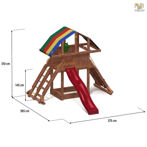 Wieża charakteryzuje się innowacyjnym, niepowtarzalnym kształtem. Wymiary po złożeniu: 3,85 x 3,75 x H 3,1 Wymiar platformy: 140 cm x 116 cm. Możliwość rozbudowy o dodatkowe moduły i zabawki.