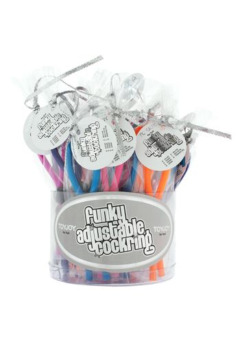 Zestaw zawiera 25 wysokiej jakości pierścieni od TOYJOY (5 granatowych, 5 fioletowych, 5 różowych 5 pomarańczowych 5 niebieskich). Pierścienie są elastyczne, regulowane i niedrogie! Ustaw zestaw kolorowych pierścieni na ladzie i kuś klientów małymi prezentami zapakowanymi w luksusowym celofanie.