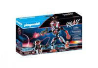 Zestaw do zabawy składa się z figurki PLAYMOBIL oraz robota bojowego z ramieniem chwytającym. Broń laserowa miga na czerwono. Zestaw zawiera baterie 2 x 1,5V LR41
