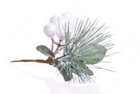 Gałązka iglasta delikatnie pobielona, owoce białe ośnieżone oraz zielone listki.