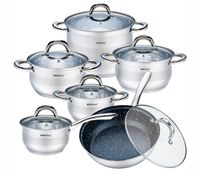 KOMPLET GARNKÓW 12 ELE. KINGHOFF z PATELNIĄ Z POWŁOKĄ GRANITOWĄ. Komplet wykonany ze stali chromowo-niklowej 18/10. Stal nierdzewna chromowo-niklowa z której wykonany jest cały komplet jest nierdzewna, wytrzymała i długowieczna. Zastosowany materiał jest nie tyko najlepszy z możliwych, ale także świetnie się prezentuje i jest wyjątkowo łatwy w czyszczeniu oraz posiada właściwości bakteriobójcze. Naczynia w tym komplecie posiadają matowy pasek w środku (INOX). Wnętrze polerowane. Ferromagnetyczne 5-warstwowe dno akutermiczne (5mm) z warstwą aluminiową gwarantuje doskonały rozdział i magazynowanie ciepła. Wszystkie garnki z kompletu można używać na wszystkich rodzajach kuchenek, również na kuchni indukcyjnej. Nitowane uchwyty (polerowane). Na wewnętrznej stronie każdego garnka znajduje się praktyczna miarka. Przyzwoite, umiarkowanie ciężkie garnki działające na indukcji, za bardzo atrakcyjną cenę.
