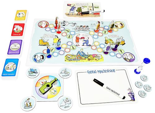 W Gierkach Małżeńskich będziecie przesuwać swoje pionki po planszy, wchodząc po kolei na pola z zadaniami losowanymi z czterech talii kart. Za rozwiązywanie zadań otrzymacie żetony kupidyna. Wygrywa para z największą pulą żetonów.