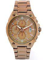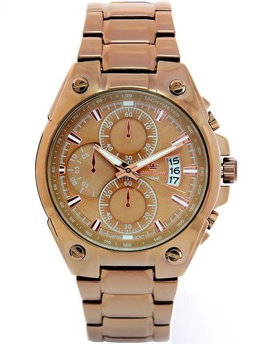 Opis zegarka: Mechanizm: W zegarku osadzony został mechanizm kwarcowy, zasilany baterią sr-626. Pasek/Bransoleta:Bransoleta stalowa pokryta utwardzaną powłoką IPG/IPS Koperta: Stalowa powlekana metodą IPG/IPS. Szkiełko: Szkło mineralne. Wodoszczelność: Water Resist 5 BAR (50M) zegarek uszczelniony, odporny na zachlapanie. Tarcza: Sygnowana logiem producenta.Małe ozdobne tarcze i wskazówki: nieruchome imitacje wskazań chronografu. Datownik: Wyświetla aktualny dzień miesiąca oraz tygodnia. Technologia HQ PLATING IPG/IPSJonowa metoda napylania powłoki zegarka, zapewniająca jednolitą, gładką powierzchnię oraz podwyższoną odporność na ścieranie Wymiary: - koperta : szerokość 44 mm, wysokość 48 mm - tarcza : średnica 36 mm - szerokość bransolety: 23/20 mm - grubość zegarka: 10 mm - obwód zegarka do 20,5 cm