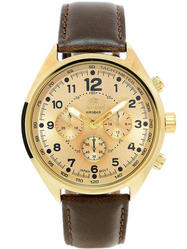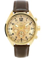 Opis zegarka: Mechanizm: kwarcowy Miyota produkowany przez Citizen Watch, zasilany baterią sr-626.Koperta: Wysokogatunkowa stalowa - pokryta utwardzoną powłoką IPG/IPSSzkiełko: wysokiej jakości szkiełko mineralne, odporne na zarysowania.Pasek: Wytrzymały, solidny, skórzany.Wodoszczelność: Water Resist 5 BAR - zegarek uszczelniony, odporny na zachlapanie.Tarcza: Sygnowana logiem producenta. Dodatkowe dekoracyjne ozdobne tarcze i wskazówki: nieruchome imitacje wskazań chronografu.Technologia HQ PLATING IPG/IPS Jonowa metoda napylania powłoki zegarka, zapewniająca jednolitą, gładką powierzchnię oraz podwyższoną odporność na ścieranieNickel free: zegarek nie uczula - antyalergiczny.Wymiary:koperta: 46 × 52 × 13mmtarcza: 40mmszerokość paska: 21/19,5mmdługość całości: ok. 257mm