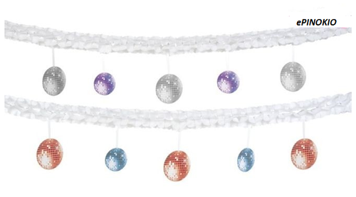NOWOŚĆ! Girlanda papierowa w stylu disco - na urodziny, wieczór panieński czy imprezę karnawałową. Motyw błyszczących kul disco w kolorze srebrnym, niebieskim, fioletowym oraz złotym. Długość sześć metrów. Dekoracje i girlandy zapewnią Ci inspirację i dobry nastrój na imprezie!