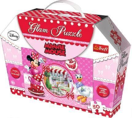 Minnie - Puzzle Glam Puzzle 50 elementów z obrazkiem, przedstawiającym spotkanie przyjaciółek Minnie i Daisy. Po ułożeniu powstanie obrazek o wymiarach 41x27,8cm. Puzzle Glam to idealna zabawka dla każdej dziewczynki, która lubi błyszczeć. Puzzle są ozdobione delikatnym, pyłkowym brokatem i po ułożeniu będą wspaniałą ozdobą pokoju. Opakowanie posiada wygodny uchwyt.