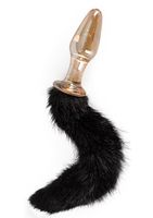 Transparent gold-coloured, unbreakable glass butt plug with a black faux-fur tail fixed on a small base. Total length: approx. 12 cm, penetration depth: 10.5 cm, diameter: 2.1 to 3.8 cm. Length of faux-fur tail: approx. 28 cm. Material: glass, acrylic.