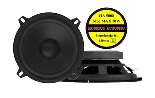 Głośnik Houston Acuoustic 5 Cali / 13 cm 8 Ohm GŁOŚNIK NISKOTONOWY HOUSTON ACOUSTIC SERII HA Doskonałość wykonania, czystość brzmienia otrzymamy z niesamowitego woofera o cewce nawiniętym miedzianym drutem na aluminiowy karkas. Wyjątkowo wytrzymała membrana została wzmocniona formowanego ciśnieniowo polipropylenu. Miękki bas zapewnia szerokie zawieszenie. Membrana całkowicie wklęsła, pozbawiona kopułki, gwarantuje duży rezonans, a także skok przy dźwięku, który rozchodzi się równomiernie i czysto. Dane Techniczne: -Moc MAX: 70W -Moc RMS: 35W -Rozmiar głośnika: 5cali / 13cm -SPL: 85dB -Impedancja : 8 Ohm -Pasmo przenoszenia : 110 - 11000 Hz -Materiał membrany: membrana formowana ciśnieniowo polipropylen IMPP metalizowana zawieszony pianką poliurytanową