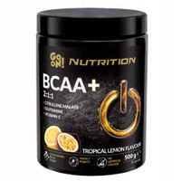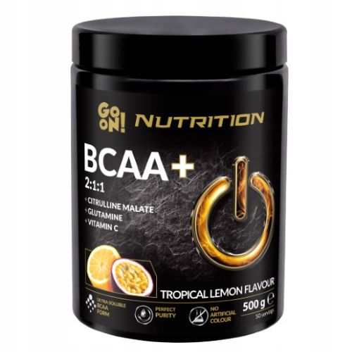 GO ON Nutrition BCAA+ - 500g Porcja: 10 g Ilość porcji w opakowaniu: 50 Opakowanie: 500g Wartość Odżywcza / Informacja Żywieniowa: Na 10 g % RWS* Wartość Energetyczna (energia) 116kJ/27kcal - Tłuszcz 0 g - w tym kwasy tłuszczowe nasycone 0 g - Węglowodany 0.5 g - w tym cukry 0.07 g - Błonnik 0.07 g - Białko 6.2 g - Sól 0.31 g - BCAA suma, w tym: 6300 mg - w tym L-leucyna 3200 mg - w tym L-walina 1600 mg - w tym L-izoleucyna 1600 mg - L-glutamina 1000 mg - DL-jabłczan-l-cytruliny 800 mg - Składniki: Mieszanina aminokwasów rozgałęzionych BCAA (31,6% L-leucyna, 15,8% L-izoleucyna, 15,8% L-walina); 10% L-glutamina, 7,6 DL-jabłczan L-cytruliny, regulator kwasowości: cytryniany sodu, kwas jabłkowy, kwas cytrynowy; aromat, substancje słodzące:acesulfam K, sukraloza; stabilizator: guma arabska; Witamina C (kwas L-askorbinowy). Może zawierać orzeszki arachidowe, inne orzechy, soję, gluten, mleko. *% Referencyjna Wartość Spożycia