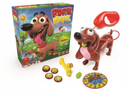 Przed każdą grą, należy nakarmić Pupila. Usuń kośc z jego pyska, wsuń porcję karmy - popychając palcem, następnie umieść spowrotem kość w pysku.