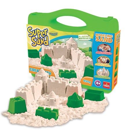 Goliath Piasek Kinetyczny Creativity Zamki na piasku… Lato – słońce i plaża. Super Sand przenosi lato i zabawę piaskiem do domu. Super aksamitne w dotyku, suche a jednocześnie „antybakteryjne” i 100% naturalne, takie jest tworzywo Super Sand. Piasek, który można używać jeszcze raz i jeszcze raz i jeszcze… Zrób babkę z piasku albo zamek z fosą. Dołączone narzędzia i piękne foremki pomogą stworzyć czego dusza zapragnie. Masa Super Sand składa się z naturalnych składników mineralnych. Jeżeli coś się rozsypie poza „piaskownice”, nie ma problemu ponieważ masa ma specjalną strukturę pomagającą w utrzymaniu czystości.Super Sand stymuluje kreatywność dzieci.Super Sand Super Piasek został uhonorowany nagrodą Zabawka Roku 2015!Daj się ponieść swojej wyobraźni i ciesz się swoimi kreacjami z Super Sand!Dotknij aby poczuć różnice. Zestaw zawiera:450 gram piasku Super Sand4 foremkikuferek-kuwetka Wiek: 4 lata+
