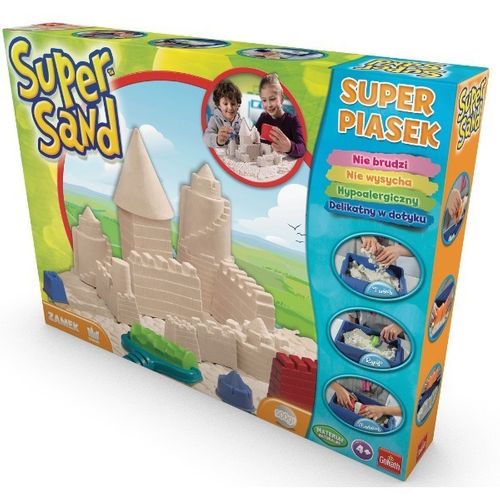 Lato, słońce i plaża. Super Sand przenosi lato i zabawę piaskiem do domu. Super aksamitne w dotyku, suche a jednocześnie antybakteryjne i 100, naturalne, takie jest tworzywo Super Sand. Piasek który można używać jeszcze raz i jeszcze raz i jeszcze…Zrób babkę z piasku, albo zamek z fosą. Dołączone narzędzia i piękne foremki pomogą stworzyć czego dusza zapragnie. Masa Super Sands składa się z naturalnych składników mineralnych. Jeżeli coś się rozsypie poza piaskownice nie ma problemu, ponieważ masa ma specjalna strukturę pomagającą w utrzymaniu czystości.Super Sand stymuluje kreatywność dzieci.Daj się ponieść swojej wyobraźni, i ciesz się swoimi kreacjami z Super Sand!Dotknij aby poczuć różnice.Dla dzieci od 4 lat. Opakowanie zawiera 900g masy piaskowej.Wiekod 4 latWymiaryop. 30,8x43x7 cm