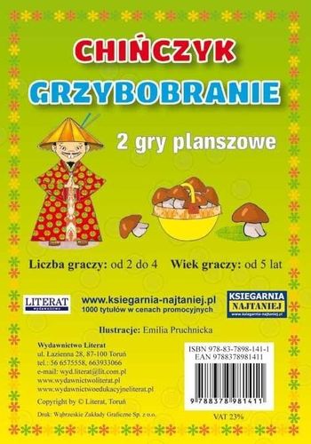 Zestaw 2 gier planszowych: Chińczyk i Grzybobranie dla 2-4 graczy w wieku od 5 lat.Gry znajdują się na tekturowej planszy dwustronnie zadrukowanej w pełnym kolorze oraz instrukcja do obu gier z regułami gry.Zestaw nie zawiera pionków i kostki do gry.