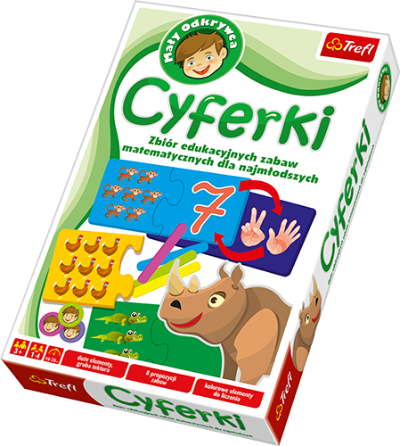 Cyferki Zbiór edukacyjnych zabaw matematycznych dla najmłodszych Cyferki to doskonała uk��adanka edukacyjna, która oswaja dzieci ze światem liczb. Ćwiczy podstawowe umiejętności matematyczne, orientację w przestrzeni, klasyfikowanie, układanie oraz proste sumy. Doskonałe wprowadzenie w świat zwierząt, liczb i zbiorów matematycznych. Produkt dostarcza wiele pomysłów na zabawę – dziecko ma możliwość zabawy w pojedynkę, jak również w grupie rówieśników. Do gry dołączone są scenariusze i propozycje do wykorzystania przez rodziców. Opakowanie zawiera 10 dużych dwudzielnych i dwustronnych kartoników puzzlowych oraz dodatkowe kolorowe elementy do liczenia, a także instrukcję z wieloma propozycjami zabaw. Duże elementy z grubej tektury pokryte są wysokiej jakości farbami, co gwarantuje bezpieczną zabawę, nawet dla małych dzieci. Wyraźne rysunki i żywe kolory są dopasowane do stopnia rozwoju dziecka. Seria Mały Odkrywca to gry edukacyjne dla dzieci w wieku od 2 do 6 lat. Wszystkie pozycje zostały opracowane przez zespół specjalistów z różnych dziedzin: pedagogiki, filologii, logopedii, socjologii oraz psychologii. Każda z gier została przygotowana, by wspomagać rozwój poznawczy i intelektualny dziecka: rozwija myślenie logiczno-matematyczne, stymuluje rozwój słownictwa i zdolności komunikacyjne, ćwiczy koordynację wzrokowo-ruchową, trenuje pamięć i koncentrację, pobudza wyobraźni�� oraz kreatywność. Nasze produkty to połączenie zabawy z elementami edukacyjnymi, a jednocześnie twórcze pomysły na spędzenie czasu z dzieckiem. Produkty z serii Mały Odkrywca są testowane przez dzieci oraz pozytywnie opiniowane przez nauczycieli przedszkolnych. Nasze produkty zostały opracowane i wyprodukowane w Polsce.