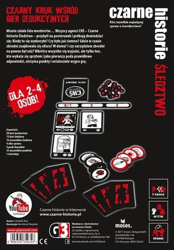 "Czarne historie Śledztwo" to zupełnie nowa odsłona, bestsellerowej serii gier karcianych z dreszczykiem. W innowacyjnej dla cyklu formule, od 2 do 4 graczy w wieku od 12 lat rozwiązuje sprawy kryminalne pozostałych uczestników.