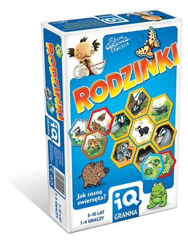 GRANNA Gra Rodzinki 0150 GRANNA 00150 Jak rosną zwierzęta? Każde zwierzątko ma mamę i tatę. Najpierw jest dzieckiem, potem rośnie, zmienia się i samo staje się mamą albo tatą... Obrazki umieszczone w pudełku przedstawiają kolejne etapy rozwoju ośmiu gatunków zwierząt. Młodszym dzieciom proponujemy układankę, starszym – ciekawą, dynamiczną grę. Zapraszamy do zabawy. Powodzenia! -\ Zawartość pudełka: – 48 kartoników do gry – 8 kart centralnych – obrazek Zwierzęta w środowisku – kolorowa instrukcja i ilustrowany komentarz zoologa Gra dla 1-4 graczy w wieku 5-10 lat Waga do wysyłki: 0,5 kg Wymiary opakowania: 27 x 19 x 5 cm Zabawka dla dziecka: 5 lat + Waga (z opakowaniem): 0,50 kg