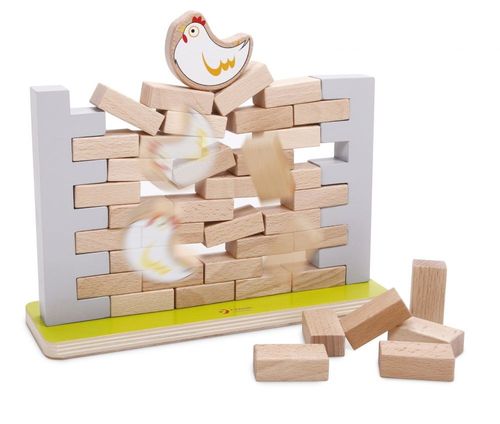 Ułóż ścianę w specjalnie przygotowanych blokach. Na górze ustaw kurę, a następnie wyciągajcie po kolei cegły ze ściany. Kiedy ściana runie gra się kończy.