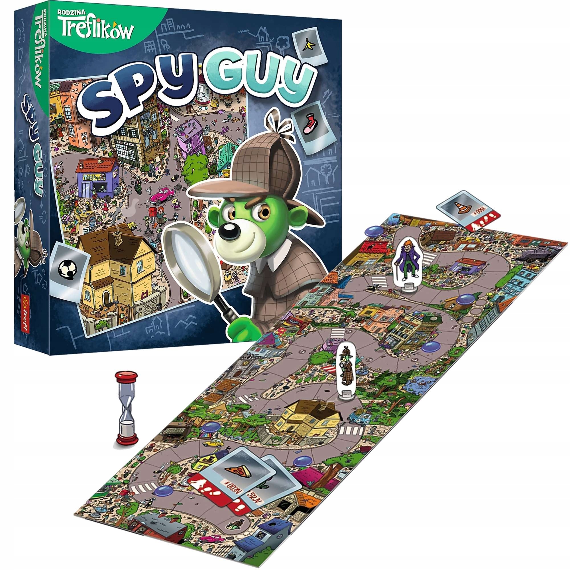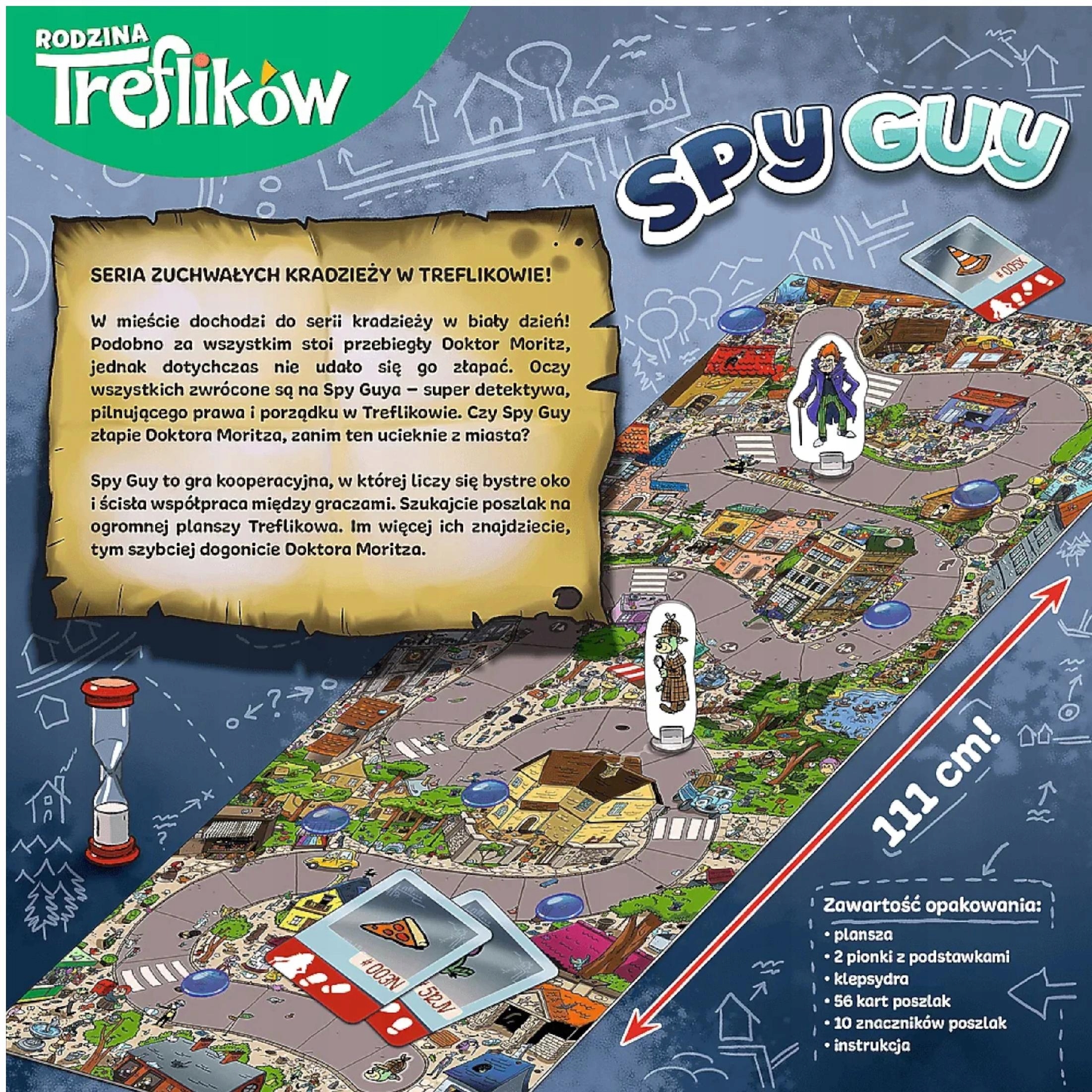 współpraca między graczami. Na ponad metrowej planszy musicie odnaleźć jak najwięcej poszlak poukrywanych w całym mieście. Im więcej ich odnajdziecie, tym szybciej Wasz pionek dogoni uciekającego złoczyńcę. Przedmioty, które musicie odnaleźć, zostały umieszczone na kartach poszlak. Zaznaczajcie swoje znaleziska plastikowymi żetonami do momentu, kiedy przesypie się cały piasek w klepsydrze.