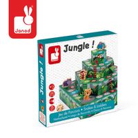 Gra wyścig Dżungla francuskiej marki JANOD to wspaniała zabawa dla dwóch do czterech osób – zarówno dzieci, jak i dorosłych. Zestaw zawiera czteropoziomową planszę-dżunglę, wykonaną z solidnego kartonu oraz drewniane elementy: 4 pionki-zwierzęta (małpka, słoń, tygrys, hipopotam) i kostkę. Gracze wcielają się w role dzikich zwierząt (do wyboru), które mają za zadanie dotrzeć do źródła w górze dżungli, tj. pola nr 57, pokonując przy tym różne przeszkody i znajdując drogi na skróty. Wygrywa gracz, który znajdzie się przy źródle jako pierwszy.