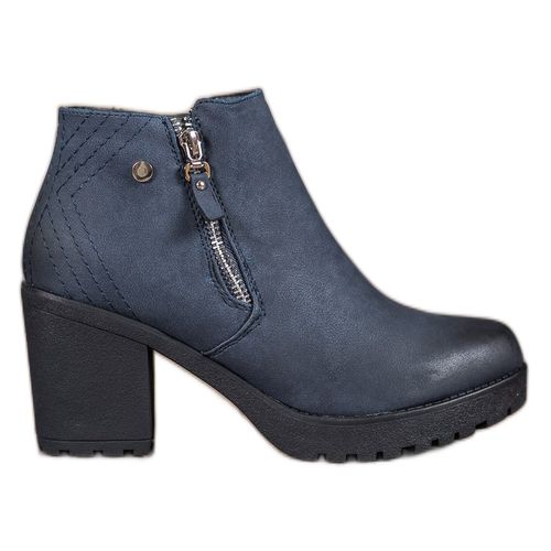 Botki damskie w granatowym kolorze wykonane są z ekologicznej skóry, a ich cholewki sięgające za kostkę mają suwak ułatwiający wkładanie butów oraz drugi - dekoracyjny od zewnętrznej strony. Buty te mają obcas typu słupek o wysokości 8 cm oraz platformę z przodu o wysokości 2 cm, co zapewnia wygodę podczas chodzenia.