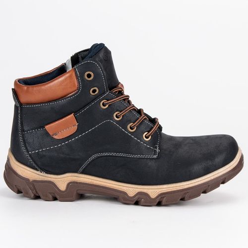 W tych granatowych traperkach wszystko wygląda bardzo ciekawie, zaczynając od kontrastujących ze sobą kolorów brązowej podeszwy z bieżnikiem, granatowej skóry ekologicznej i jasnobrązowych sznurowadeł. Inny ciekawy element, jakim dysponują te męskie jesienno-zimowe buty to ciepłe ocieplenie z kożuszka.
