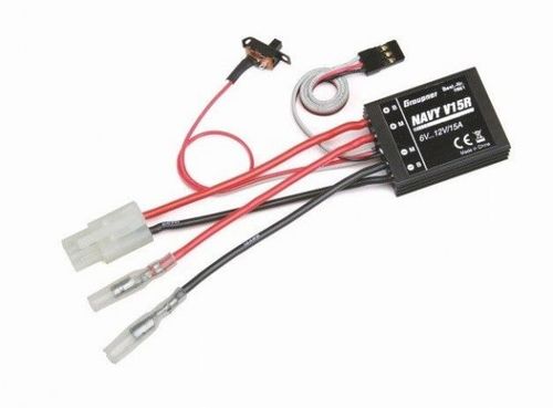 Dwukierunkowy 15A wodoszczelny regulator Graupner Navy V15R przeznaczony do obsługi silników szczotkowych. Ze wględu na swoje parametry jest on często stosowany w łodziach zanętowych.
